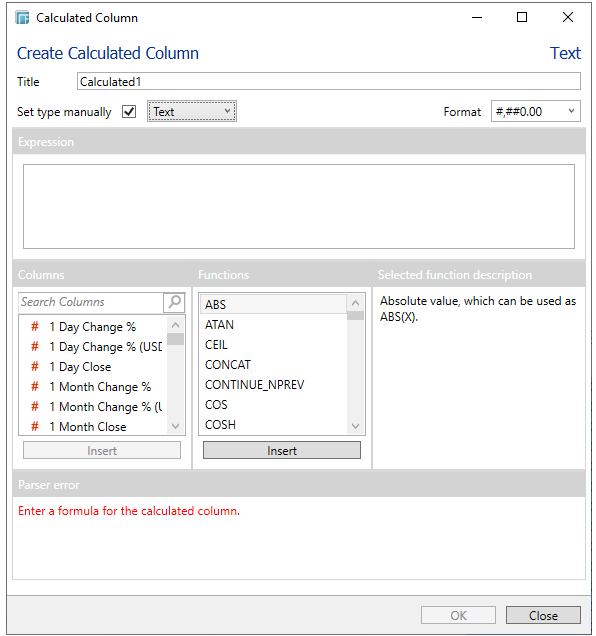 This dialog lets you create new columns based on calculations using data from other columns in your data table.