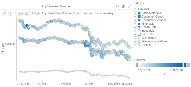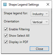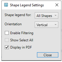 Shape Legend displays the shape variables of the associated visualization (Scatter Plot, Table, Timeseries Combination, and Timeseries Scatter Plot). You can also set the orientation or enable the ability to do a filter or to display it in the PDF output.