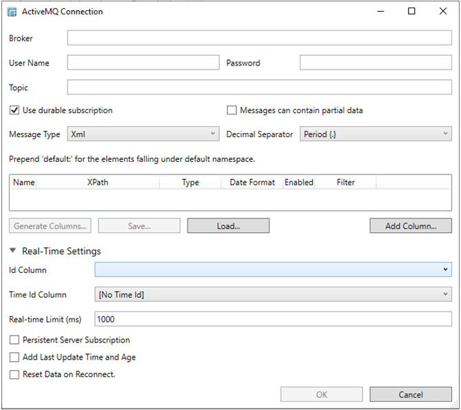 When creating a new data table, select ActiveMQ from the Connect to data dialog. The ActiveMQ Connection dialog displays.