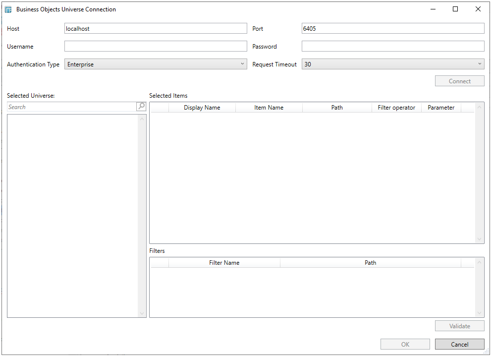 Provide the hostname, port, user ID, and password required to connect to the Business Objects Universe. If the port you wish to use is different from the default port, change the default value to the correct one.
