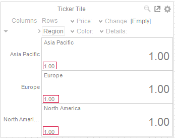 For example, in this Ticker Tile visualization, the Region column is added as the Rows, when the [Empty] value is selected, the Change will be set to 1 (1.00):
