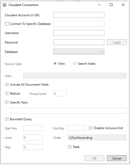 When creating a new data table, select IBM Cloudant from the Connect to Data dialog. The Cloudant Connection dialog is displayed.