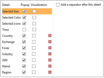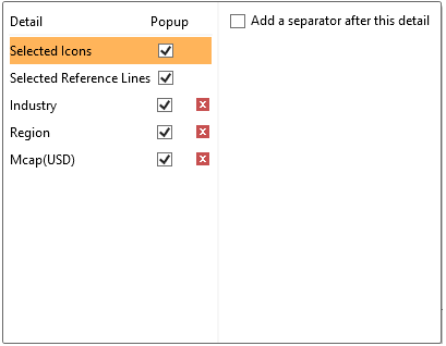 The check boxes to the right of each item define whether it is visible within the Detail pop-up.