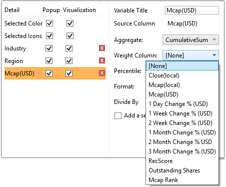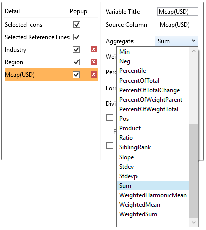 If you set the aggregation method to Cumulative Sum, Cumulative Sum By Max, Ratio, Percent of Weight Parent, Percent Weight of Total, Weighted Harmonic Mean, Weighted Mean, or Weighted Sum, the Weight Column drop-down list is enabled that allows you to select the weight column to be used.