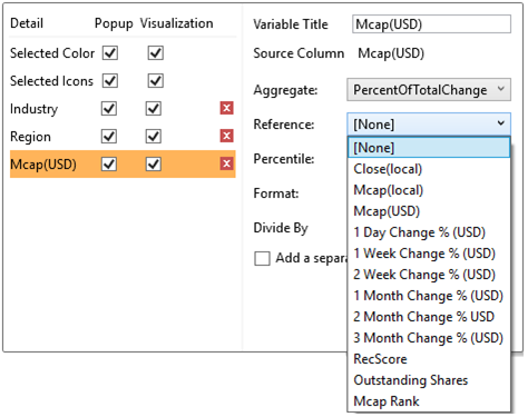 If you set the aggregation method to Percent of Total Change, the Reference is enabled that allows you to select a reference column to use.