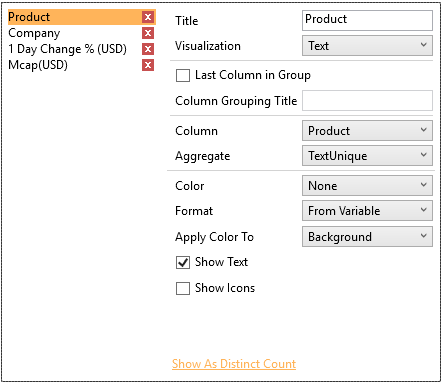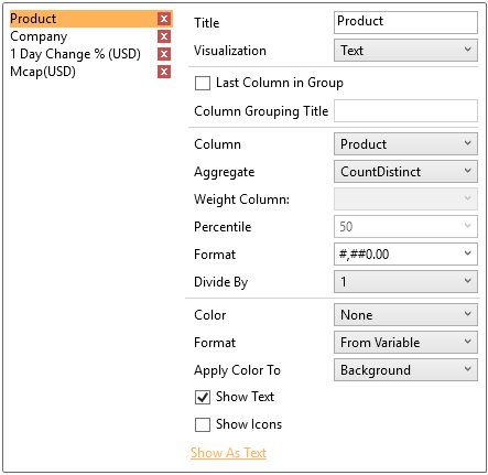 By default, the aggregates of Product and Company are both set to TextUnique.