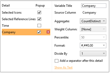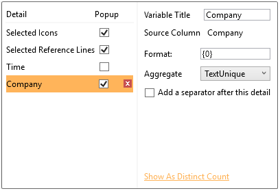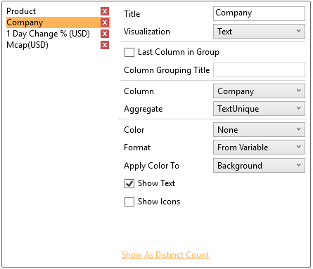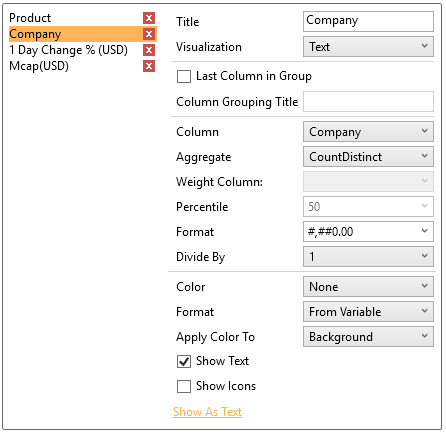 You can also opt display the Company column as a distinct count by clicking Show as Distinct Count. The dialog changes to show numeric properties with the Aggregate set to CountDistinct: