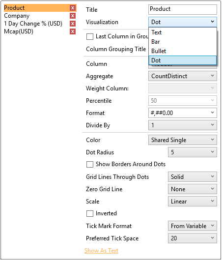 To display the Product column as a distinct count, click Show as Distinct Count. The dialog changes to show numeric properties with the Aggregate set to CountDistinct: