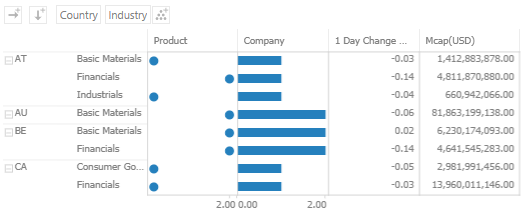 Country, Industry, Product and Company are text columns while 1 Day Change % (USD) and Mcap(USD) are numeric columns.