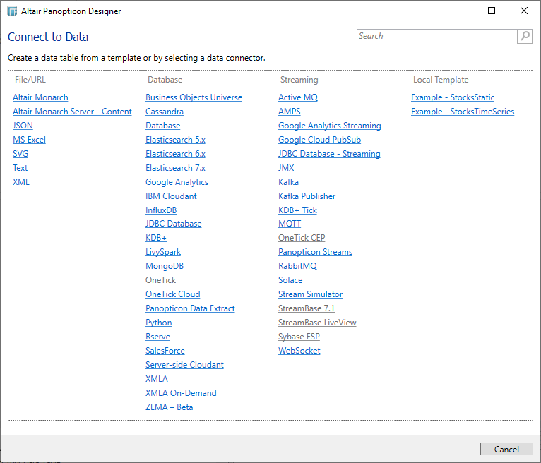 You must select the data you want to use in a Panopticon Designer (Desktop) workbook. The data definition can be unique to a single workbook. You can also save the data definition locally for use by other Panopticon Designer (Desktop) users or publish it to the Panopticon Visualization Server.