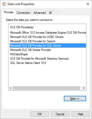 If you want to connect to a relational database, the Data Link Properties dialog displays with a list of OLE DB Providers: