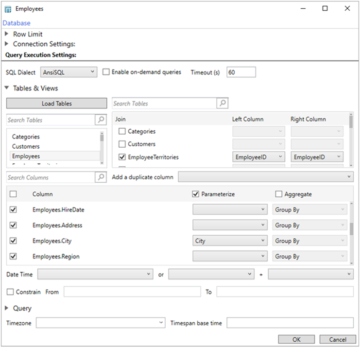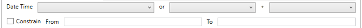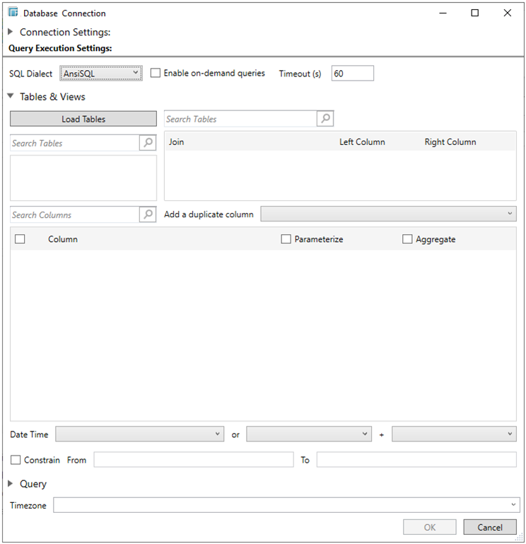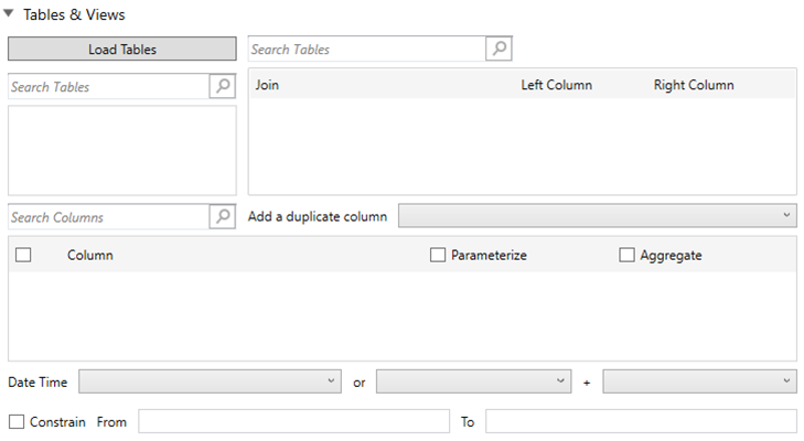 If only a selected date time range of the table / view is to be queried, the selected time column or columns should be selected, then the constraint checkbox checked, and the From and To text boxes completed; either with values or with parameters.