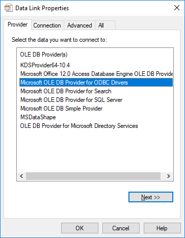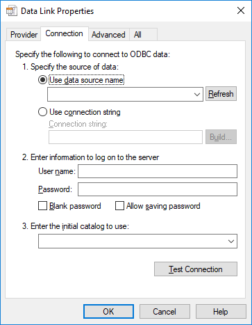 Click the Next >> button. The Connection tab of the Data Link Properties dialog is displayed. This tab will be dependent on the selected provider. The screen shot below shows the tab for an ODBC connection.