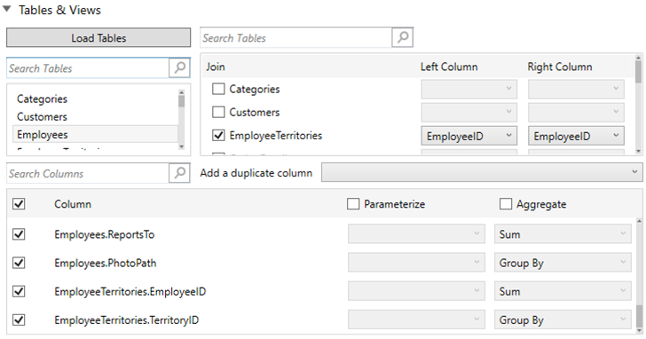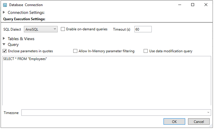 The dialog allows selection of columns from these Tables and Views, or alternatively by selecting the Query expander button, entering of SQL queries, or stored procedures.