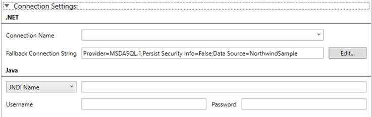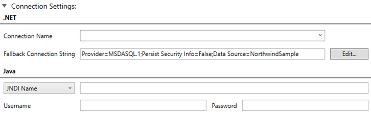 The Connection Settings section can be expanded for additional configuration. This can include Java connectivity, which will solely be used by the Panopticon Visualization Server for data retrieval, and the .NET Connection Name, which may be solely used by the Panopticon Visualization Server.