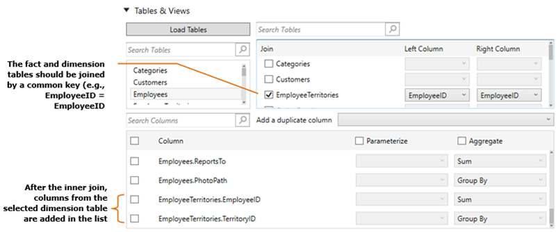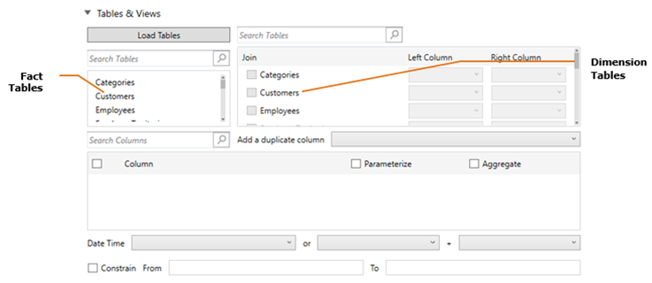 Clicking Load Tables loads the list of tables and views in the left list box (Fact Tables), which can be filtered by entering text in the Search Tables search box. The same list of tables and views is loaded in the right list box (Dimension Tables), which can be filtered by entering text in the Search Tables list box.