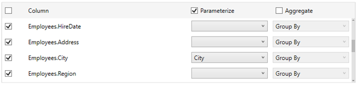 If you wish to parameterize a specific column, check the Parameterize check box, and match the parameter to the appropriate column. By default, they will be matched on name.