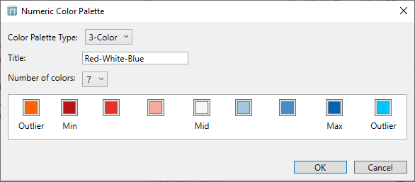 Diverging Palettes use a three color gradient between a minimum, middle and a maximum value. Numeric columns containing both positive and negative values default to the Diverging Palette with the Red White Blue color palette selected.