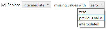 The interpolation can replace missing numeric values with zero, the previous value, or an interpolation between known values.