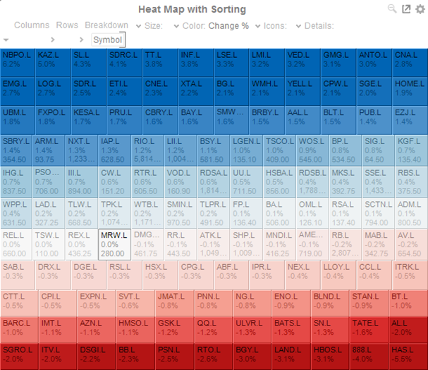 A Heat Map represents each item in the data set as an equally-sized cell, unlike a Treemap that uses the size of the box to represent a qualitative value and location to represent hierarchical relationships. In a Heat map, the color of the square represents a quantitative value relative to the other boxes in the Heat map, while the location can represent the sorting of another quantitative or categorical value. This allows the analyst to see all of the data items simultaneously. The user can also hover over any item to bring up more detailed information on demand.