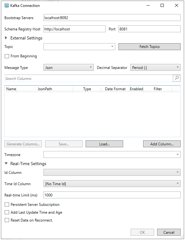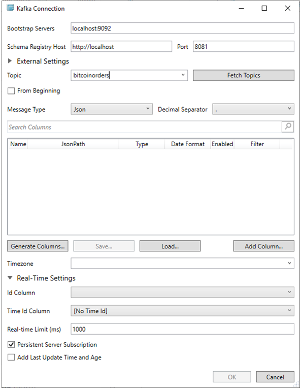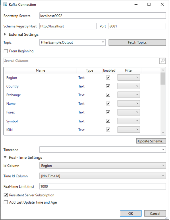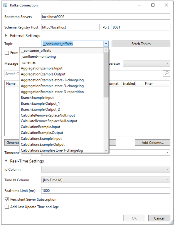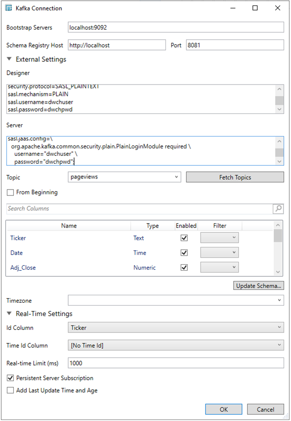 The Kafka connector allows connection to Apache’s Kafka message bus on a real-time streaming basis. Specifically the connector allows Panopticon Designer (Desktop) to subscribe to XML, JSON, Text or FIX based messages that are published on topics. The data format itself is arbitrary, and consequently, the connection includes the message definition.