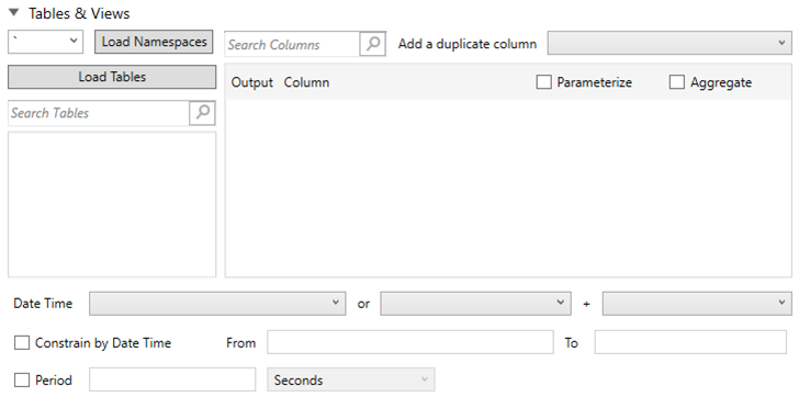 Click Load Tables. This loads the list of tables and views, which can be filtered by entering text the Search Tables search box.