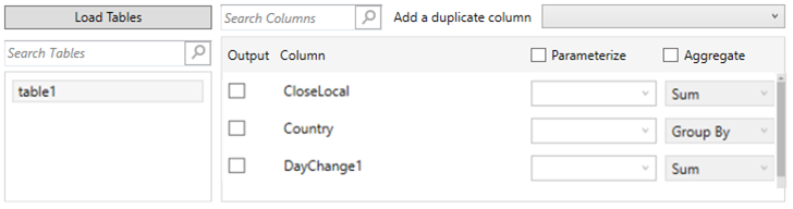 When a table or view is selected, the Search Columns listing is populated. By default, all columns are returned through SELECT * FROM TABLE.