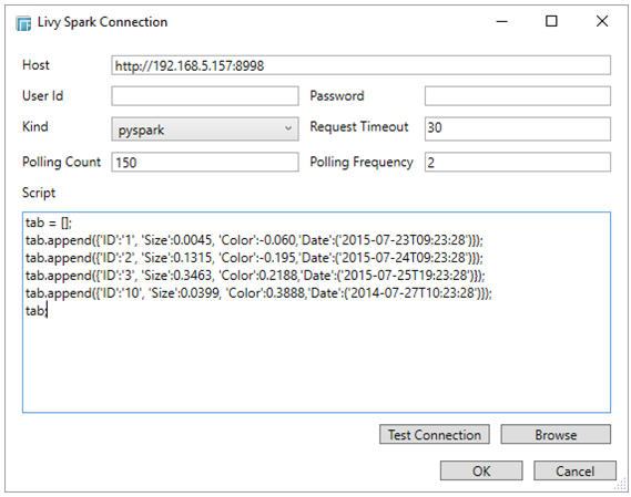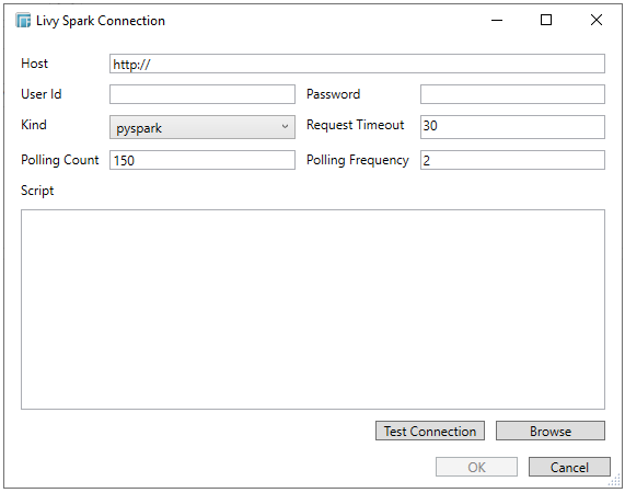 Provide the Host URL (e.g., http://<IP or name of the machine>:<port number>), User ID, and Password required to connect to the Livy Server.
