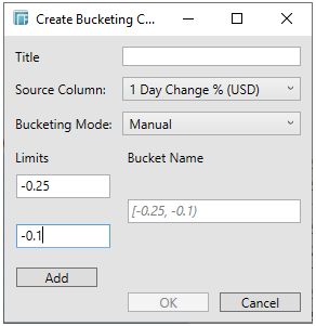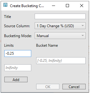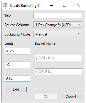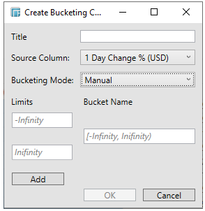 Numeric data is represented as a continuous set of values in displays and filters. Sometimes it may be necessary to manually specify customized limits. This can be achieved with Manual bucketing.