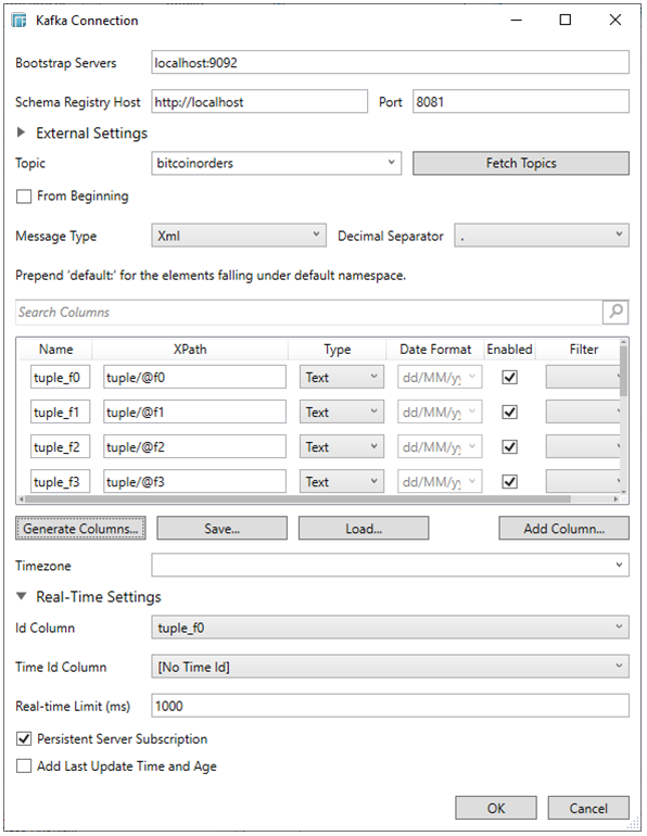 Click Add Column to add columns to the Kafka connection that represent sections of the message.