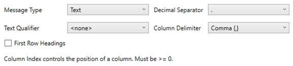 If Text has been selected, confirm the Decimal Separator, Text Qualifier, Column Delimiter, and if the first row of the message included column headings.