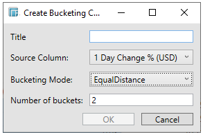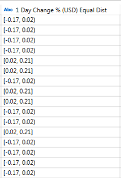 For example, for the 1 Day Change % (USD) column, the minimum value is -0.35 and the maximum value is 0.21 and when you specify 2 buckets, the equal distance ranges will be the following: