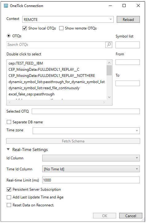 The OneTick CEP connector allows connection to OneMarketData OneTick tick history databases on a streaming subscription basis. The connector supports either: