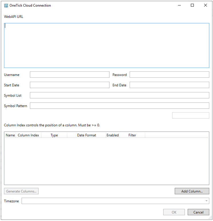 Enter the OneTick Cloud WebAPI URL into the WebAPI URL box with the following format:
