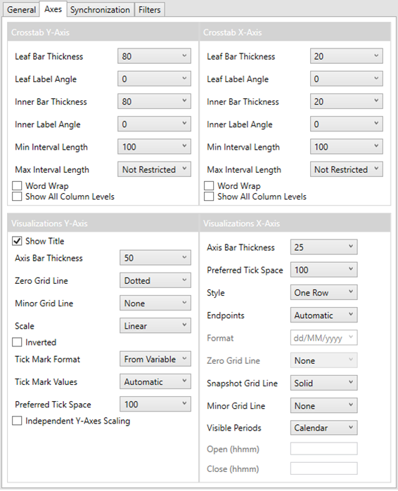 Refer to Cross Tab Axes, Visualizations Axes, and Time Axes for more information.