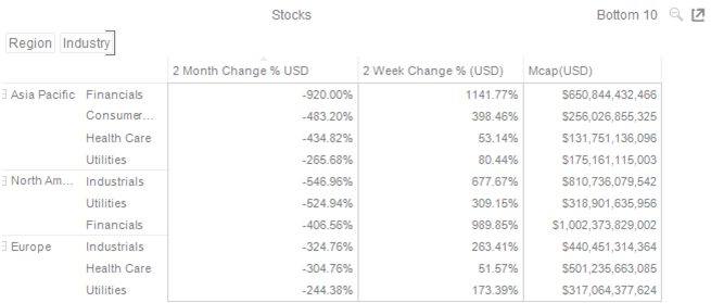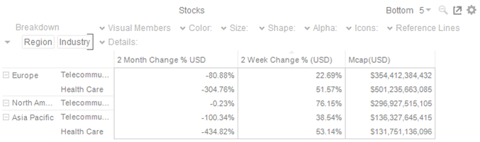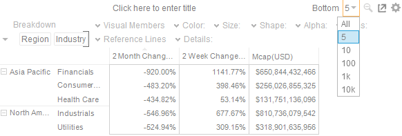 By default, Bottom 5 is selected with the bottom 5 values (e.g., -920.00%, -483.20%, -434.82%, -546.96%, -542.94%) of the leaf item (e.g., Industry field) for the next-to-leaf-node (e.g., Region field) in the breakdown.