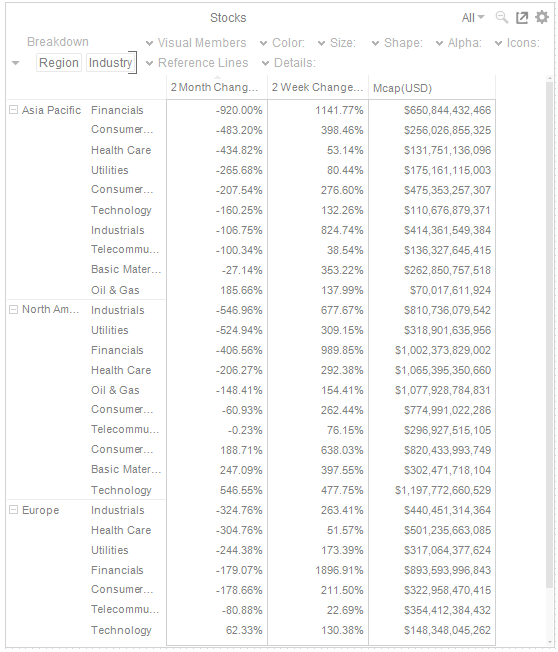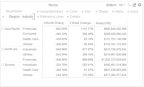 For the example above, the breakdown fields are based on the sorting made on the first Visual Member, 2 Month Change % USD.