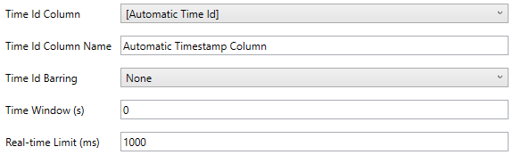 A streaming time series window can be generated by creating a compound key with the Id Column, plus a separately specified Time Id column. The Time Id column can be from the source dataset, or alternatively automatically generated.
