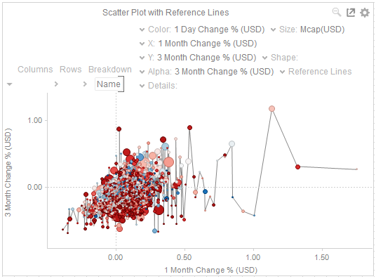 For this sample, after adding the same column used for the Y-axis (3 Month Change % (USD)) as a Reference Line, all of the values on the Scatter plot are then taken and sorted horizontally along the X-axis, then a line is drawn between the values.
