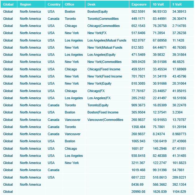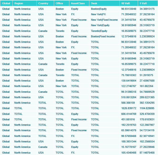 An example data format is included below, which first lists the lowest level data, followed by the aggregates. The Column titled Desk defines whether the row is aggregate or a leaf value.