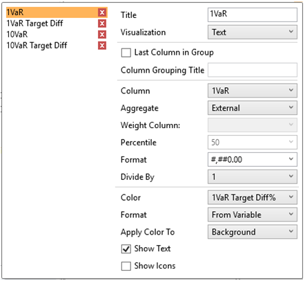 When working with financial risk data, especially Value at Risk (VaR), the data will be by definition non-additive, and cannot be calculated internally within Panopticon Designer (Desktop). As a consequence, we allow aggregates to be retrieved in addition to the base data set. Configuration of the External aggregate can be supplied explicitly by the user or implicitly from the data plug-in.
