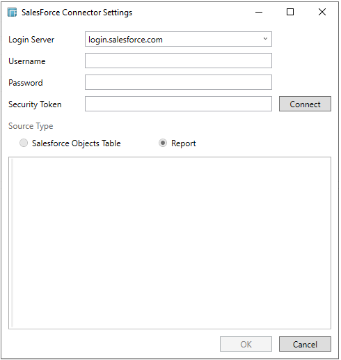 When creating a new data table, select Salesforce from the Connect to Data dialog. The Salesforce Connector Settings dialog displays.