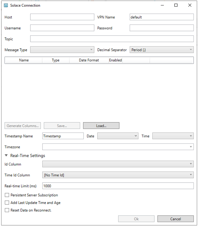 When creating a new data table, select Solace from the Connect to data dialog. The Solace Connection dialog is displayed: