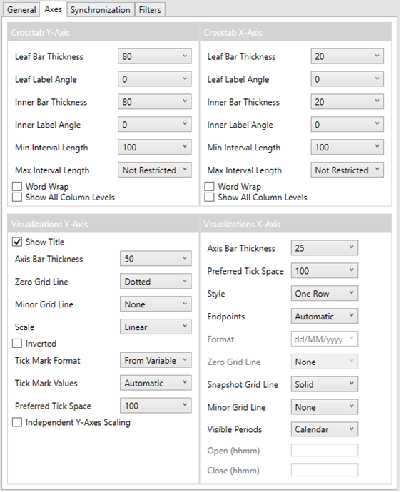 Refer to Cross Tab Axes, Visualizations Axes, and Time Axes for more information.