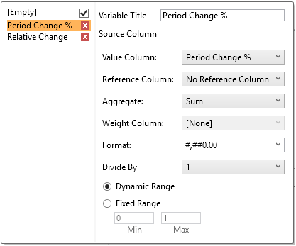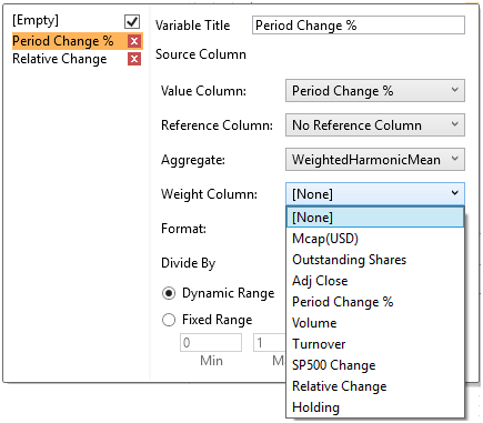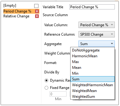 If you set the aggregation method to WeightedSum, WeightedMean, or WeightedfHarmonicMean, the Weight Column is enabled that allows you to select the weight column to use