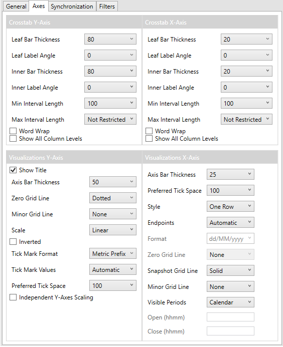 Refer to Cross Tab Axes, Visualizations Axes, and Time Axes for more information.