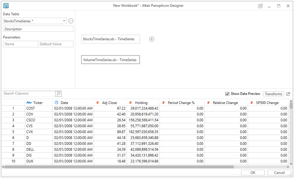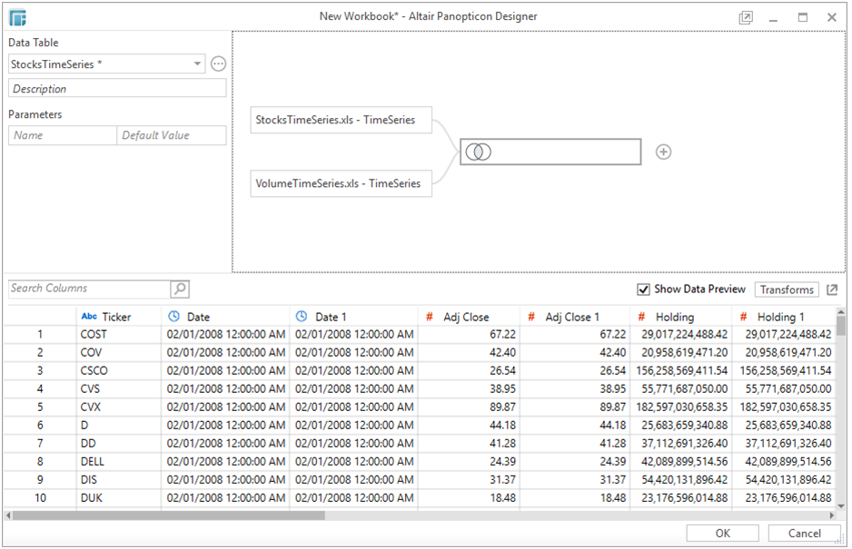 To perform the Union, the multiple source tables are added to the data table. A Join is then established from the unique ID field on the left source table to the unique ID field on the right source table.
