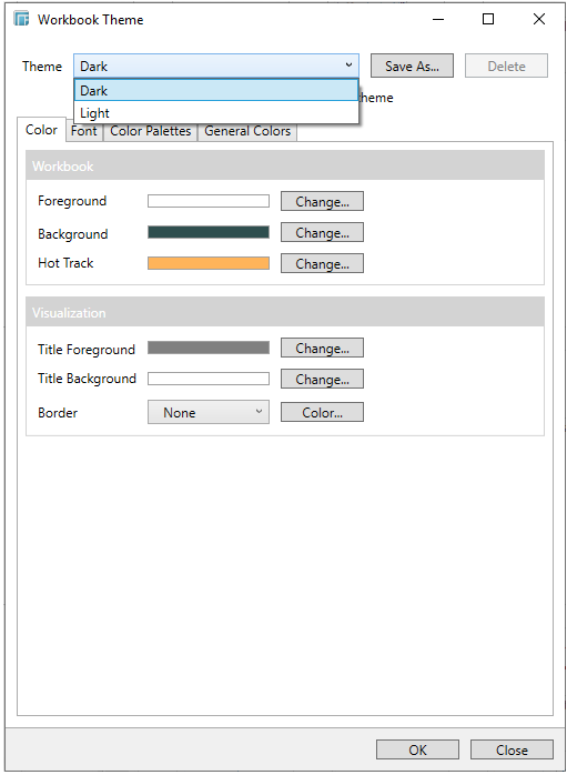 Workbook themes are set of configurable settings that affect all colors and fonts of visualizations and dashboards in a workbook. This configuration also includes setting which among the color palettes in the Altair Panopticon Options dialog will be available for the Color variable in the visualizations. Furthermore, the general colors to be used in visualizations such as axis, background, border, and focus colors can be defined.