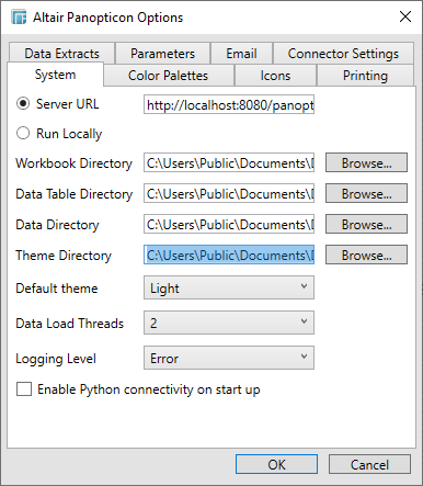 By default, there are two themes provided, Light and Dark, which are stored in the specified default directory in the Altair Panopticon Options dialog.