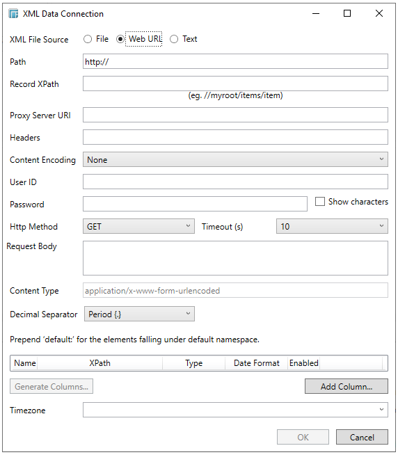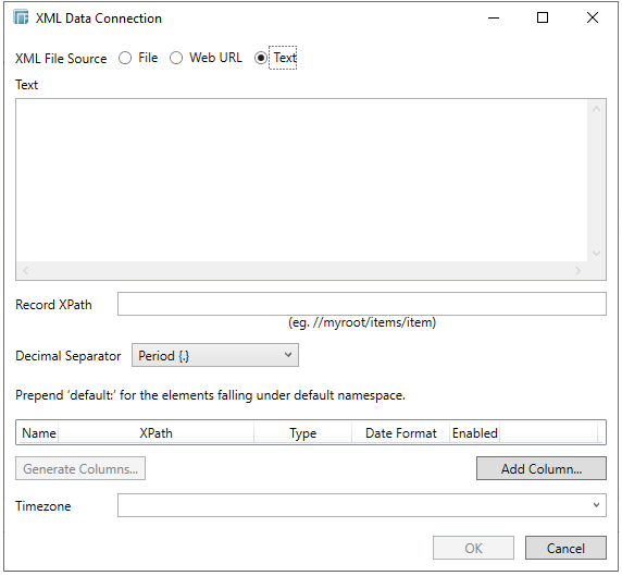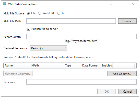 When creating a new data table, select XML from the Connect to data dialog. The XML Data Connection dialog displays.